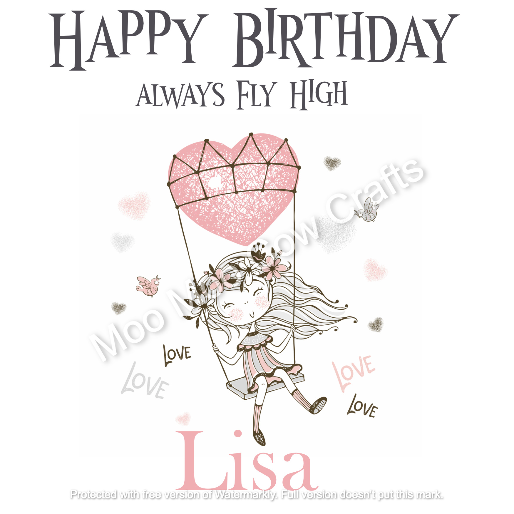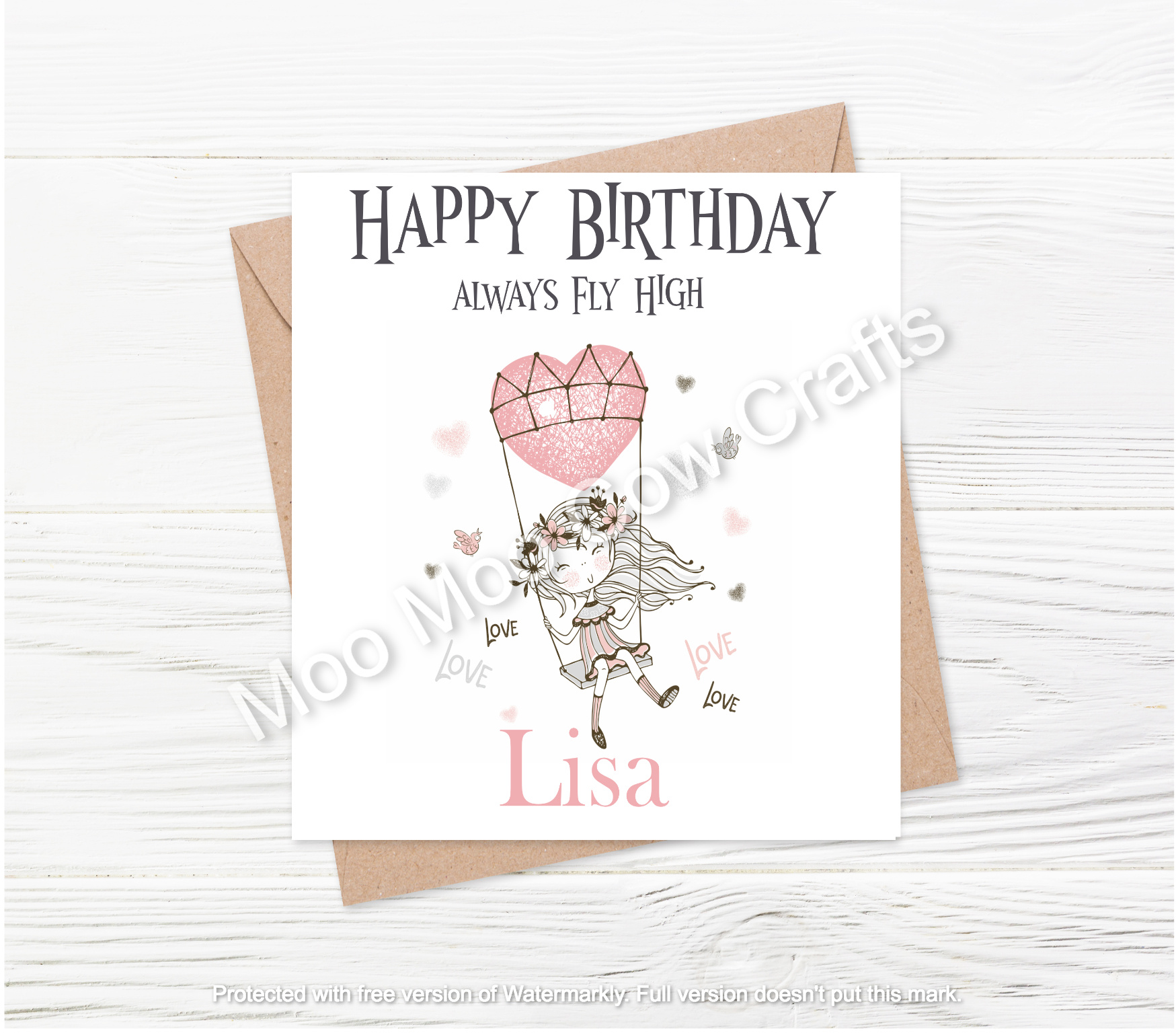 Aim High Swinging Girl birthday card can be personalised for the young lady celebrating her birthday.