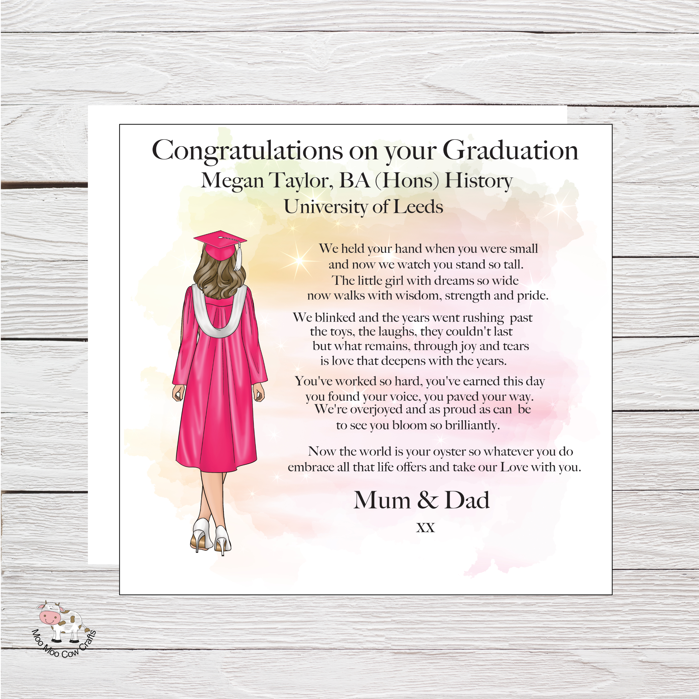 Congratulations card from parents or grandparents to young lady on his Graduation from University.