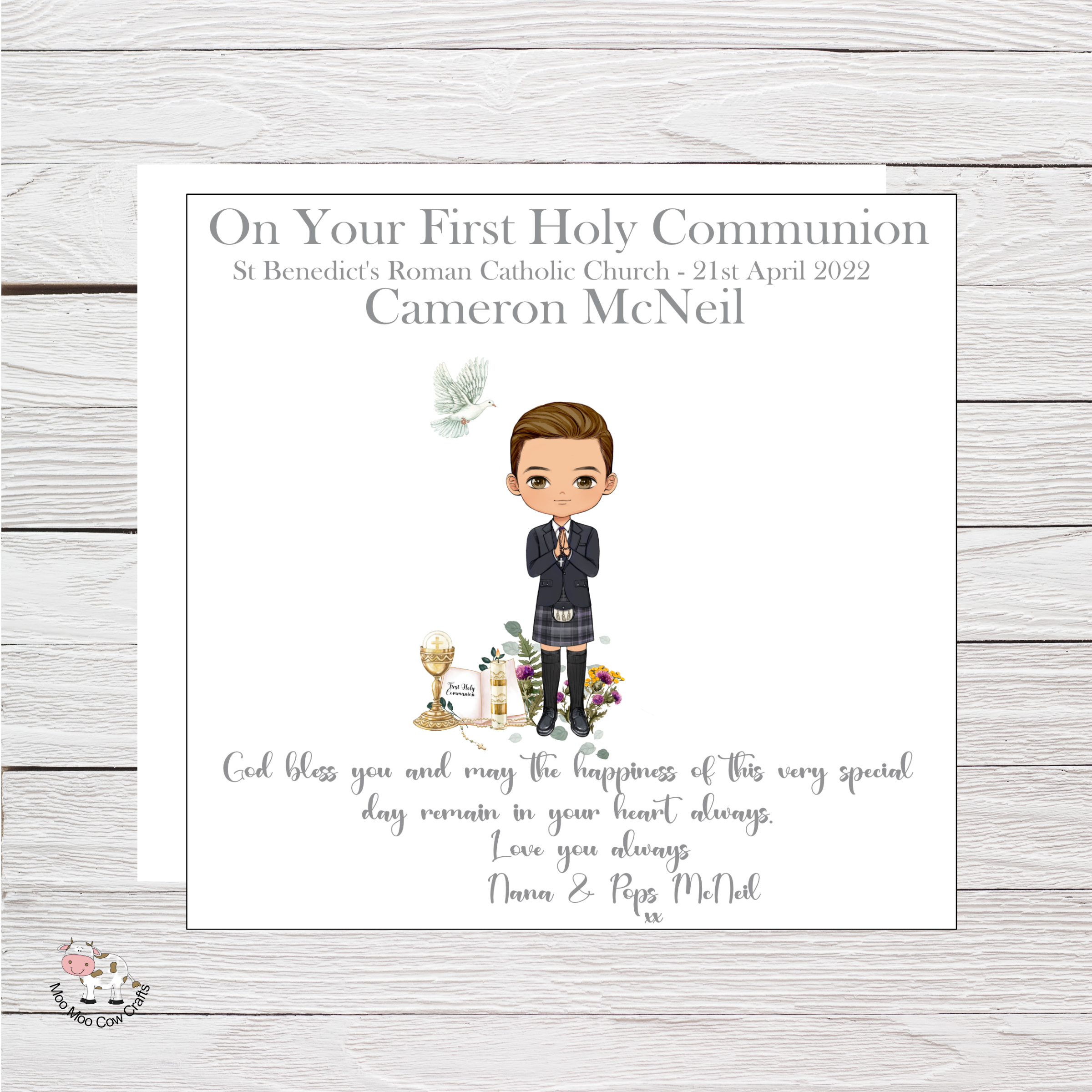 Congratulations Card for Kilt Wearing Son, Grandson, Nephew, God Child etc with matching Gift Wrap for First Holy Communion