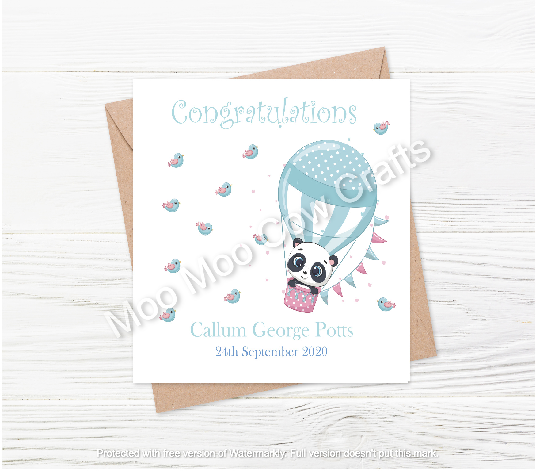 Our Hot Air Balloon Panda Congratulations baby card can be personalised to welcome the new arrival.