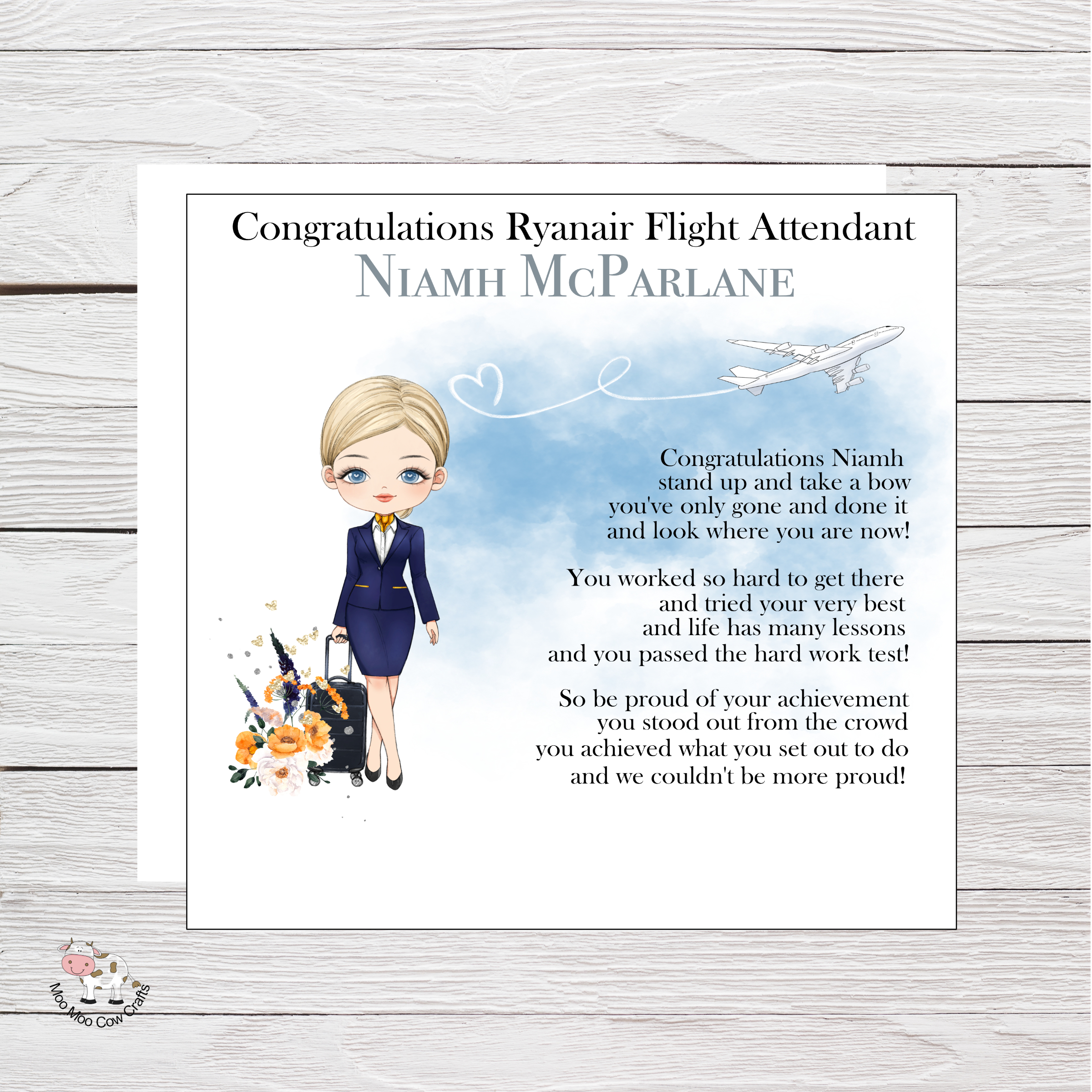 Congratulations to the new Ryan Air Flight Attendant, Ryan Air Cabin Crew Card, Well Done Card, New Ryan Air Flight Attendant Card, New Cabin Crew Job