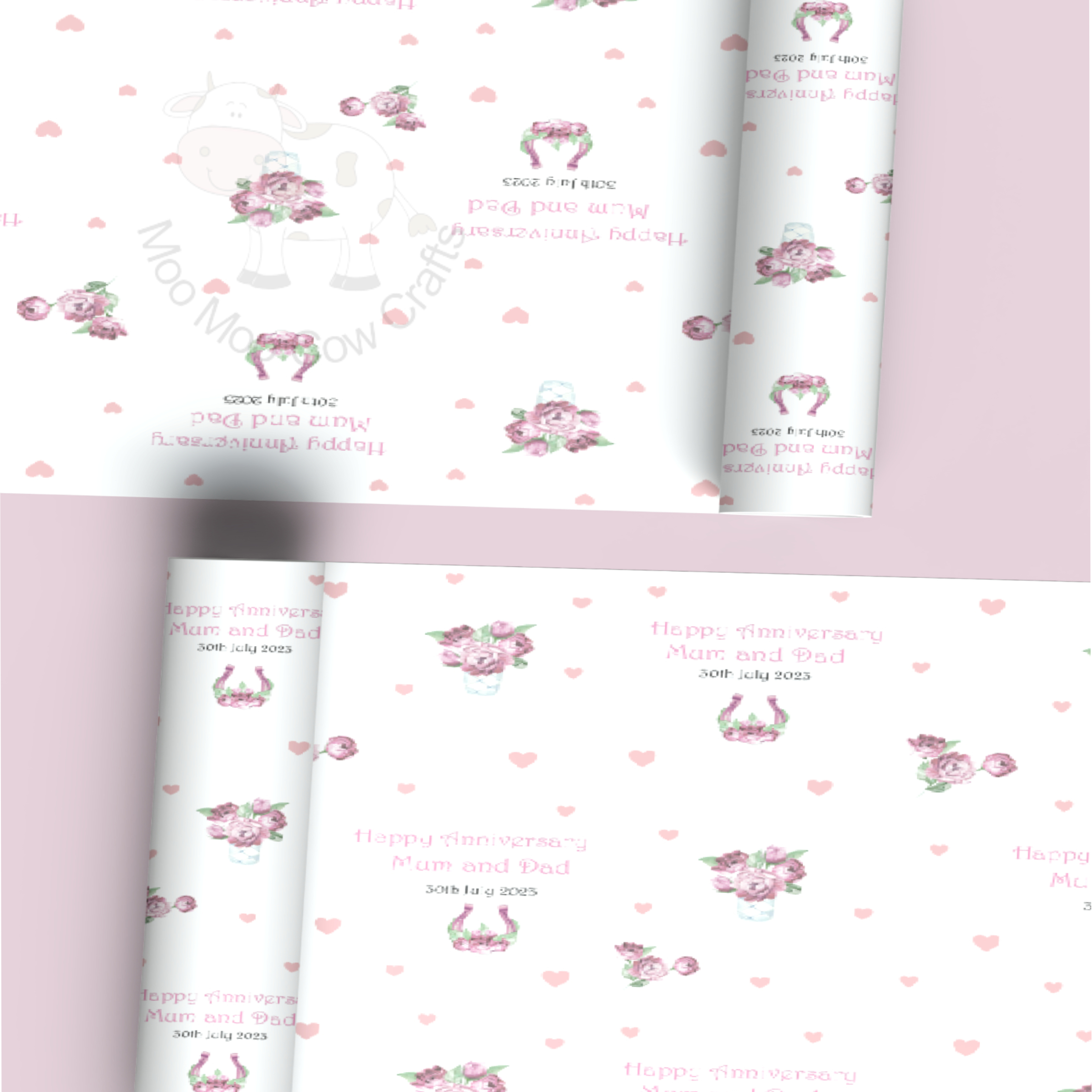 The cards have ‘Happy Anniversary’ printed on the inside facing page with matching images from the front and the gift wrap has ‘Happy Anniversary’ with the name and date if preferred.