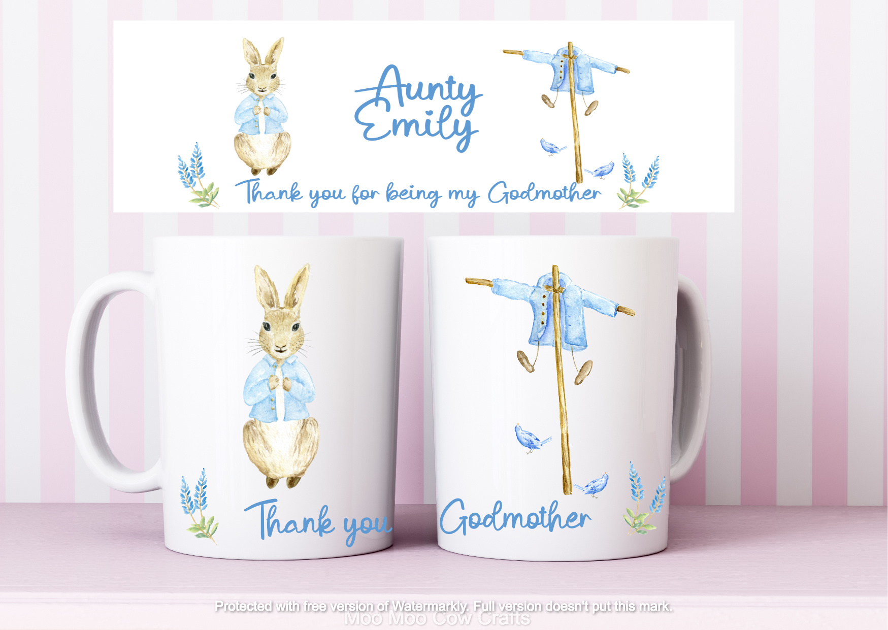 A lovely little Peter Rabbit inspired mug to say thank you for a new godparent. The mug can be personalised to say whatever name you would like and changed to Godfather. Just advise the recipient’s name if you’d like it to be personalised and it will be printed exactly as you provide so please pay particular attention to spelling.