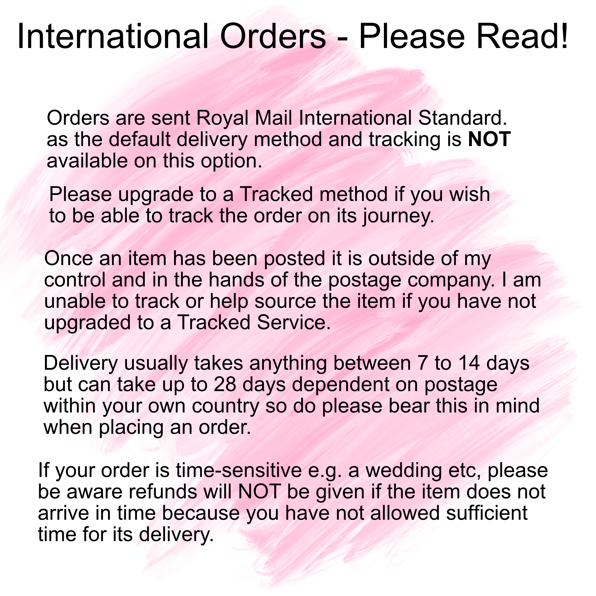 Whilst I can guarantee that I will process and send your order within 24 hours once it’s posted it is outside of my control and in the hands of Royal Mail and the postal service within your country if it’s overseas. PLEASE take this into consideration when placing an order, I’ll do my very best but short of delivering it personally I can’t make it come any quicker!