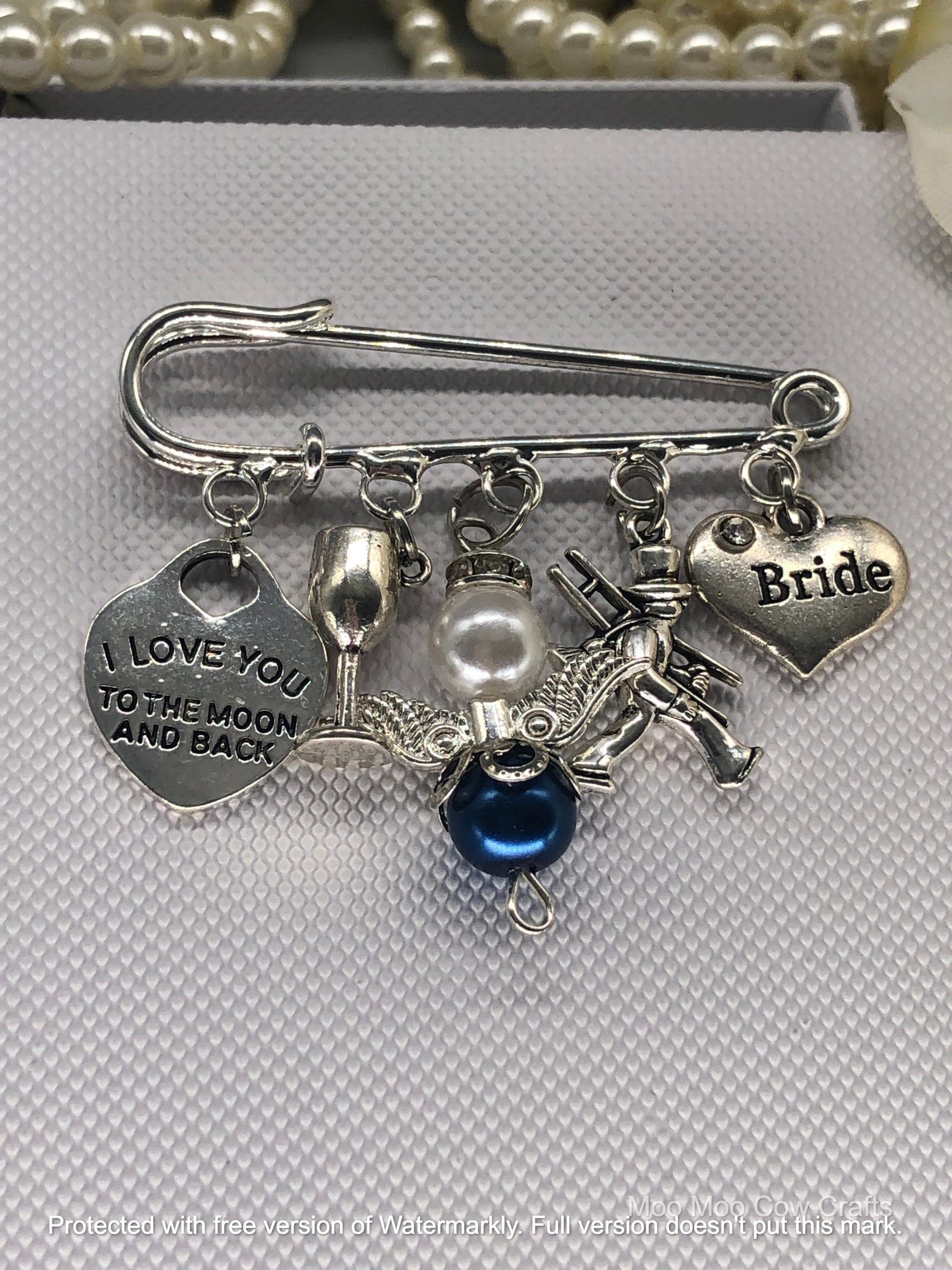 The charms are a mix of silver-plated and antique silver with white and blue pearl beads on a silver-plated kilt pin. They are provided in a gift box which can, if required, be engraved onto a small aluminium plaque that is attached to the lid to show a message from the parent(s) or the bride’s name plus her partner and wedding date. If you do not wish to have the gift box the kilt pin is provided in a white organza bag.