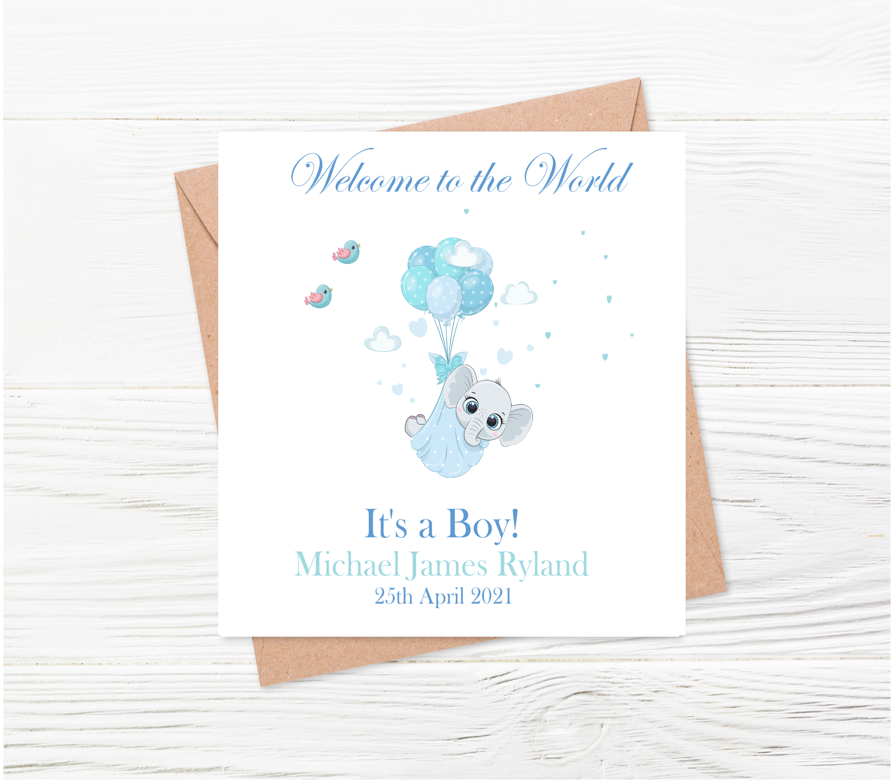 Our Baby Elephant Welcome to the World baby boy card can be personalised to welcome the new arrival.